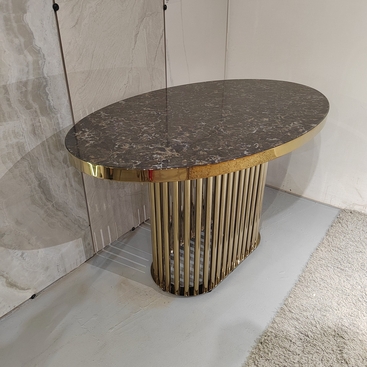 Столешница в форме "боченок" лаконичная и удобная для стола любого размера. Столешница из керамогранита и вставка из неражвеющей стали с нитрид титановым покрытием
